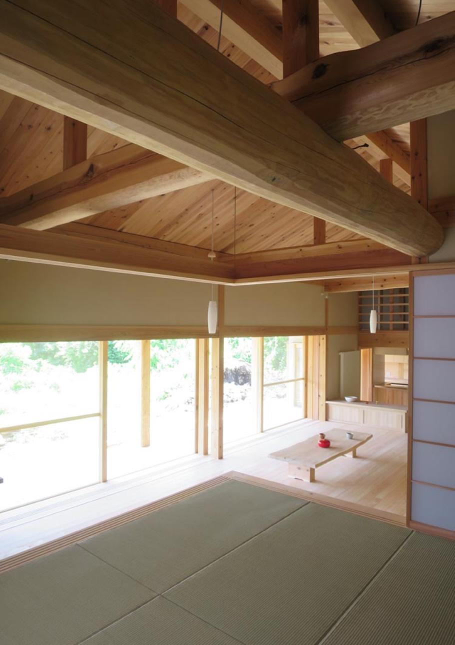外壁/着色モルタル塗り 屋根/ガルバリウム鋼板瓦棒葺 建具/木製製作建具 床/桧(厚)30 壁/Bドライ塗 天井/杉(厚)30 暖房/ラジエータパネル暖房 所在/安中市